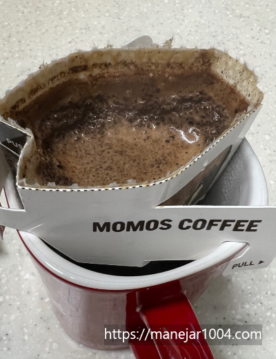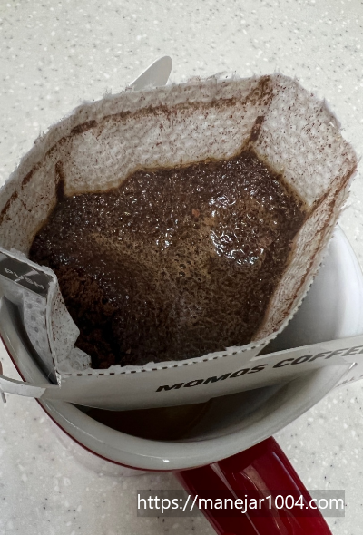 보통 드립백과 달리 옆으로 퍼지니까 어떠한 머그잔이든 걸칠 수가 있어서 잔 선택의 폭이 넓어졌어요. 드립백 커피는 항상 네모진 잔을 이용했는데, 모모스 드립백은 둥글고 입구가 큰 컵도 걸칠 수 있었어요.